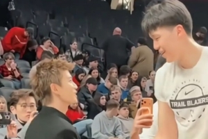 体育资讯2月8日讯 今日上午开拓者主场背靠背再战灰熊,赛前演员任嘉伦来到场边给杨瀚森加油,与其握手聊天。
