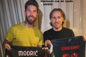 拉莫斯社媒晒出与莫德里奇交换球衣的照片,并配文:“见到你总是无比开心,我的兄弟卢卡·莫德里奇,愿我们还有更多这样的美好时光。我的烤肉简直太棒了,哈哈哈。”
